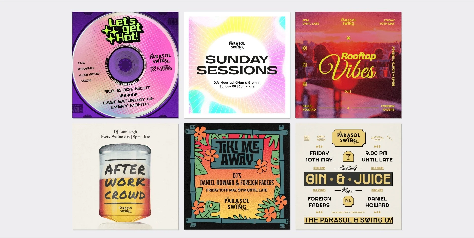 I developed a suite of versatile social media and print templates for regular events at The Parasol & Swing Co., a lively rooftop cocktail bar and late-night eatery in Auckland's Viaduct.